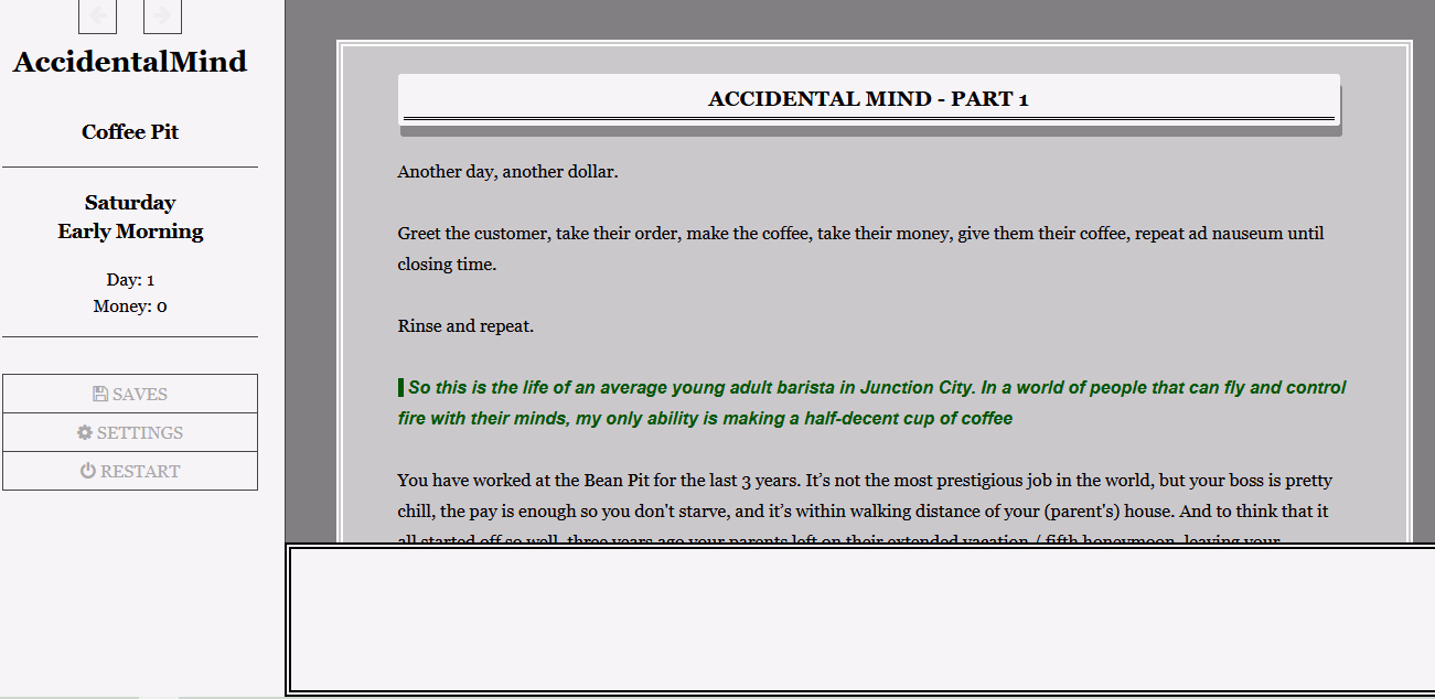 A mild-mannered shlub in a world of superpowers develops the ability to enter the dreams of other people after a horrific accident involving being crushed by a flying supervillain and uses said powers to affect those around him. A text based game with a few background images for color.