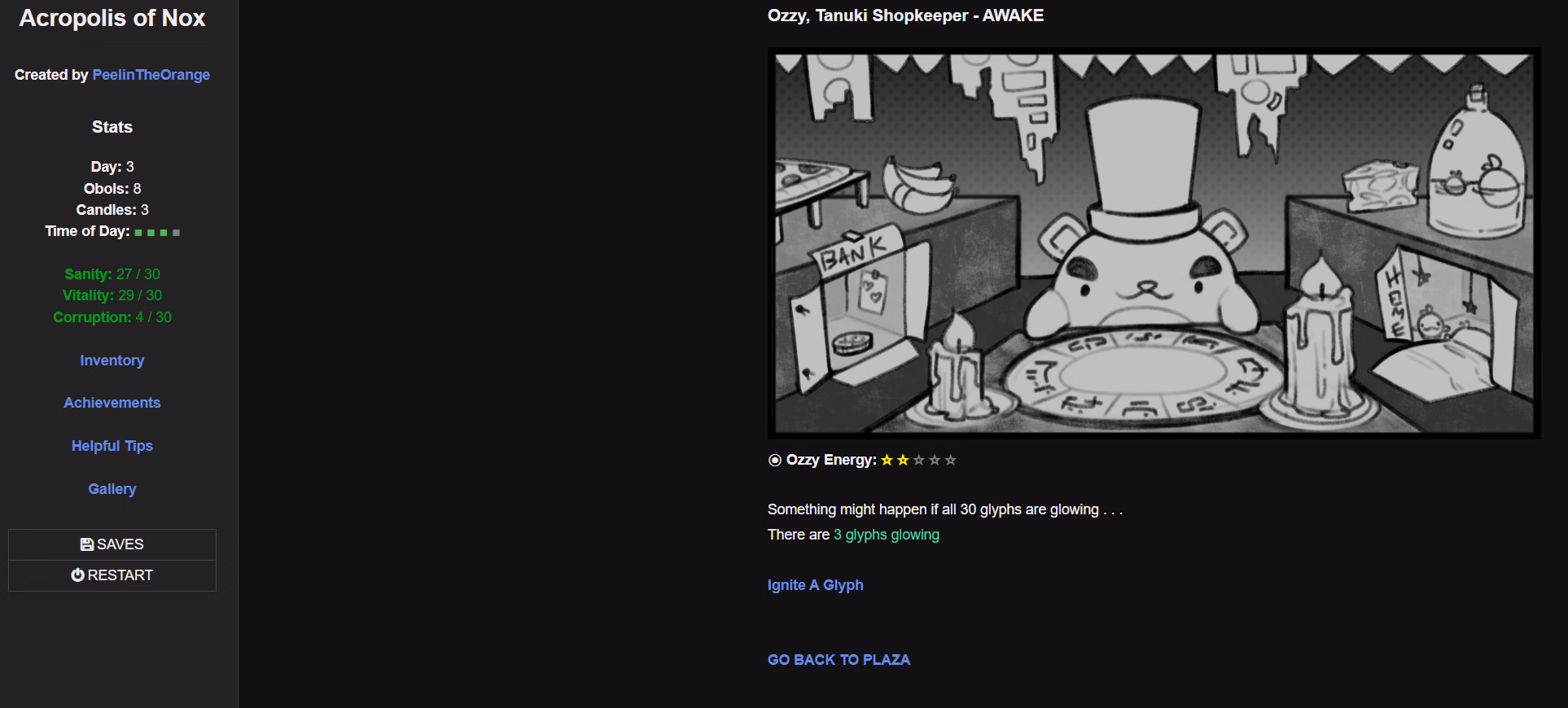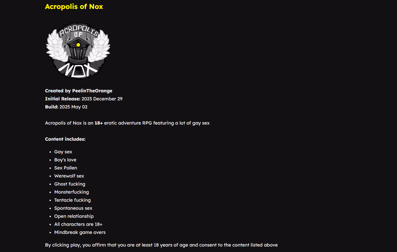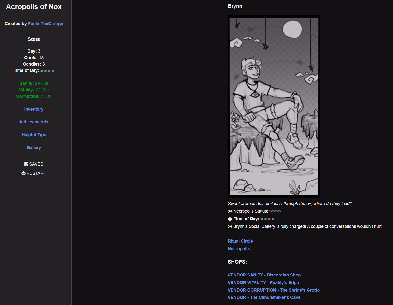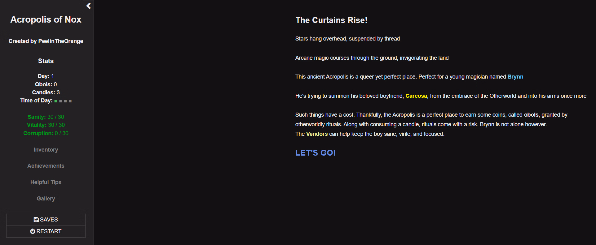Help Brynn summon his boyfriend, Carcosa, by having lots of gay sex.To do that, Brynn must earn obols aka coins. However, obols aren’t free, he’ll need to satisfy men and monsters alike to earn enough.Nothing cums easy without some hard work