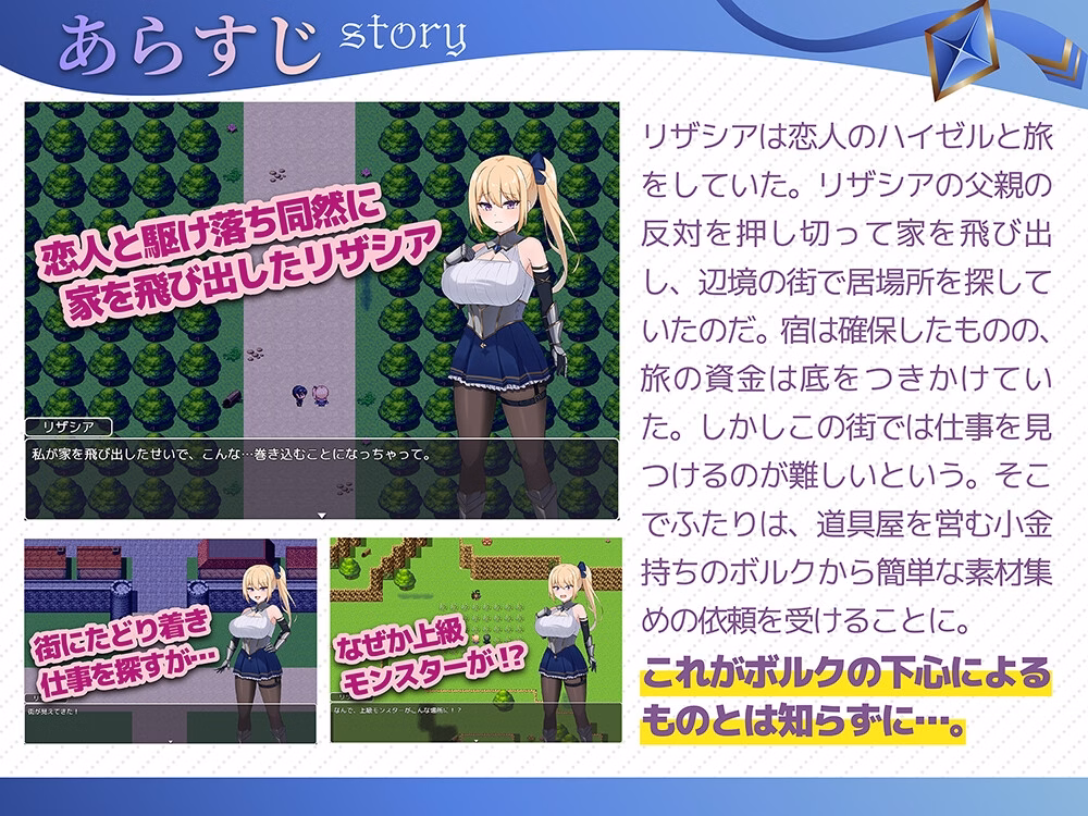 Lizashia was traveling with her lover, Hazel.After her father vehemently opposed their marriage, the two eloped and fled their hometown, searching for a place to start a new life in a remote border town.They managed to secure a modest room at an inn, but their travel funds were quickly running out. The town was small, tightly supervised by its own military garrison, and work for outsiders was hard to come by.Worried for the young couple, the tavern matron mentioned a man named Bork — a small-time but wealthy shopkeeper who ran the local general store — and suggested they ask him if he had any work.Following her advice, Lizashia and Hazel approached Bork and were given what seemed like a simple job: gathering materials in the surrounding area in exchange for pay. It looked like a straightforward, honest opportunity to get back on their feet.However, an unforeseen encounter during this job sends everything spiraling out of control.Unbeknownst to them, Bork’s request is tainted by his hidden desires… and accepting it will change Lizashia’s fate forever.