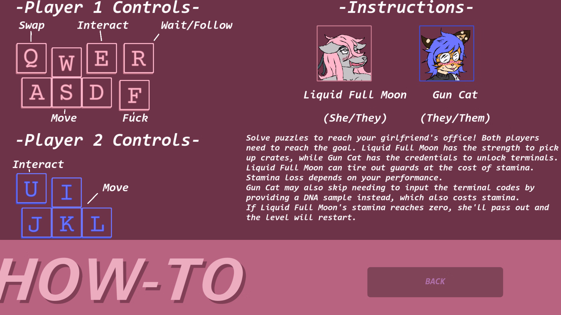 My girlfriend is still the leader of of a rival organization, so we can’t be seen together. I’m trying to visit her, but I’ve been caught by one of her scientists!We’ve decided to work together towards a common goal: A threesome!Liquid Fullmoon needs to sneak through her girlfriend’s compound so they can meet up for a fun night together! She’s teamed up with Gun Cat, a scientist who can bypass security. Help her navigate and avoid detection while using each of their strengths so solve puzzles. Collect items along the way for even kinkier scenarios!