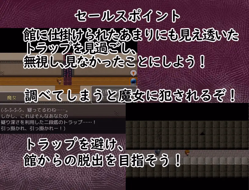 An RPG where you’re attacked by a shotacon witch in a mansion.The protagonist, an herb seller, enters a mansion to take shelter from the rain where a shota-loving witch is rumored to live…Can he escape while avoiding the very obvious traps?