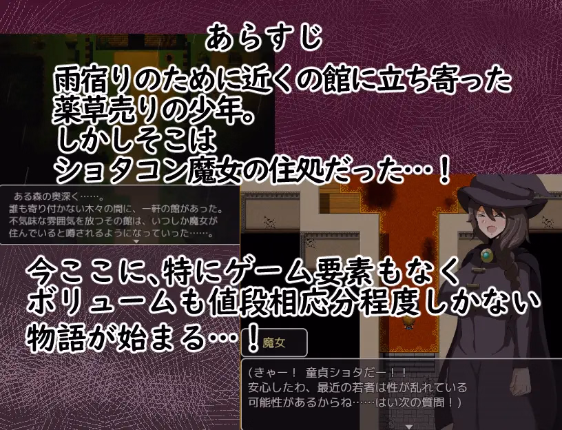 An RPG where you’re attacked by a shotacon witch in a mansion.The protagonist, an herb seller, enters a mansion to take shelter from the rain where a shota-loving witch is rumored to live…Can he escape while avoiding the very obvious traps?