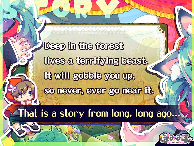 Deep inside the forest lives a scary beast.It will gobble you up,so never, ever go near it. A guy in a red hood wanders intoa deep, deep forest andmeets a werewolf lady there…Run away! Run away!Or the scary wolf will catch you!And so begins a tale full of joy and wonder…
