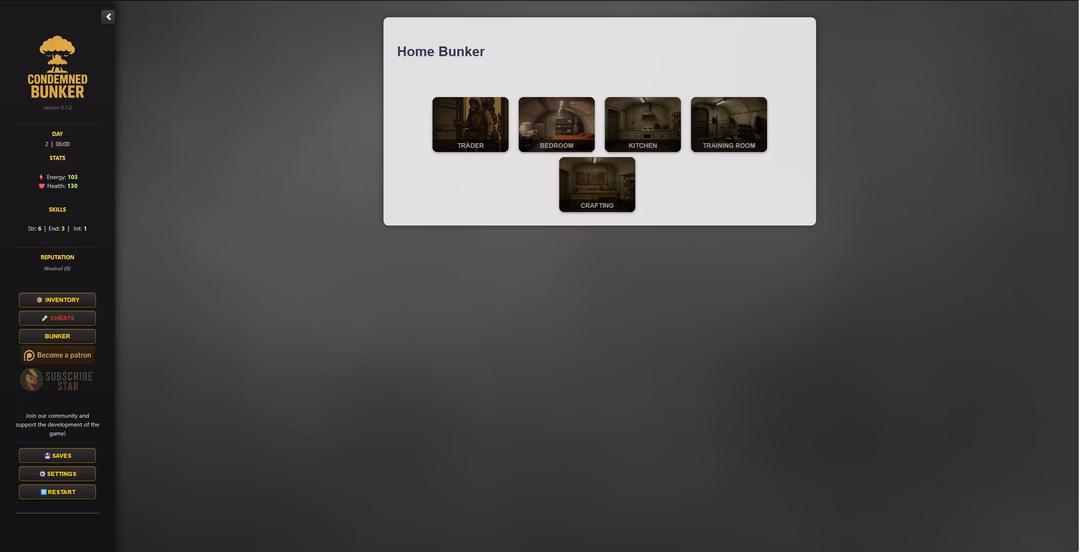 Condemned Bunker is a short, replayable 18+ survival game where every day is a struggle to endure inside a sealed shelter after a nuclear catastrophe.Gather supplies, choose companions, and make tough decisions that can either keep you alive or lead to disaster. Hunger, thirst, wounds, and fear are constant threats, but trust, conflict, and intimacy between survivors may be even more dangerous.