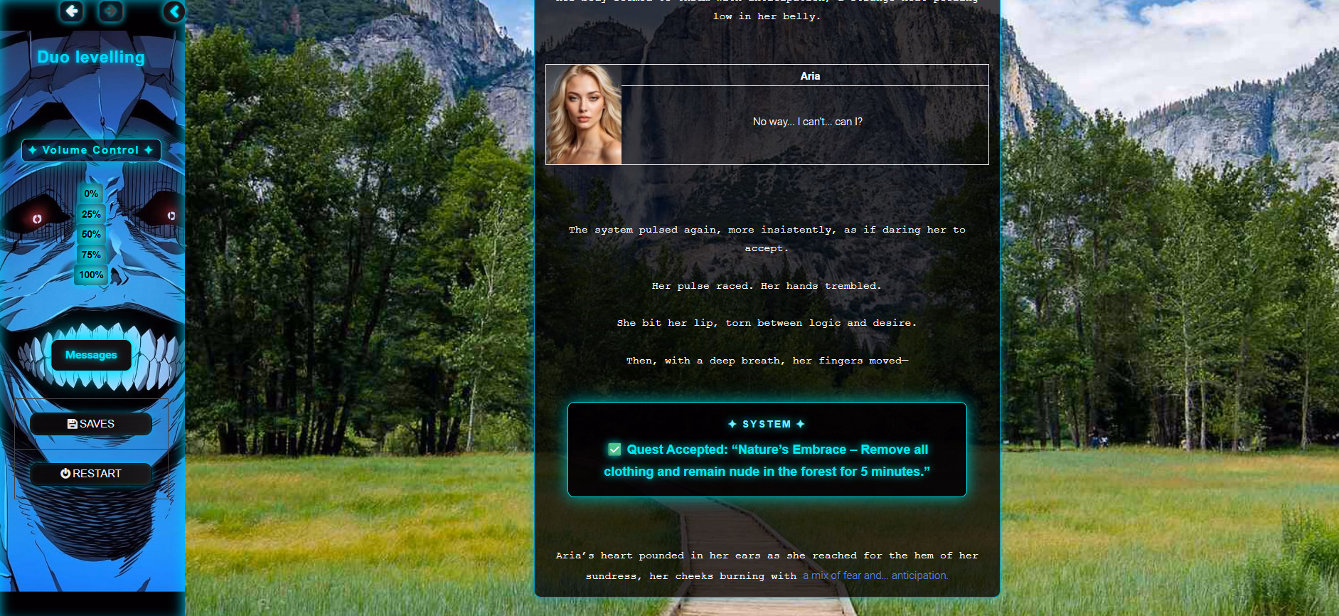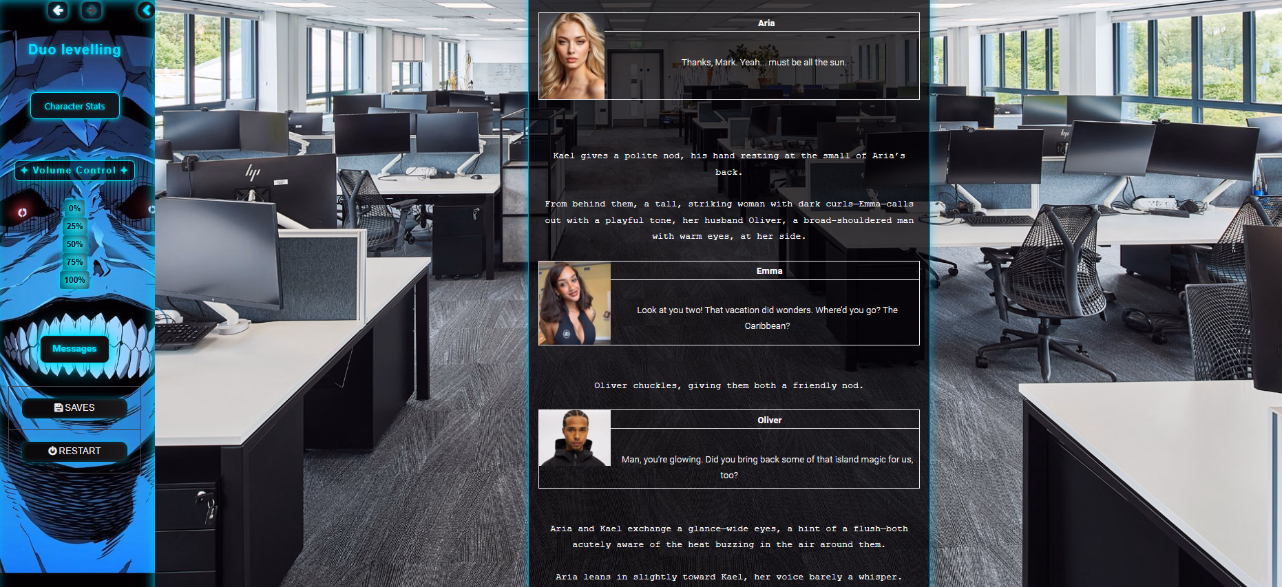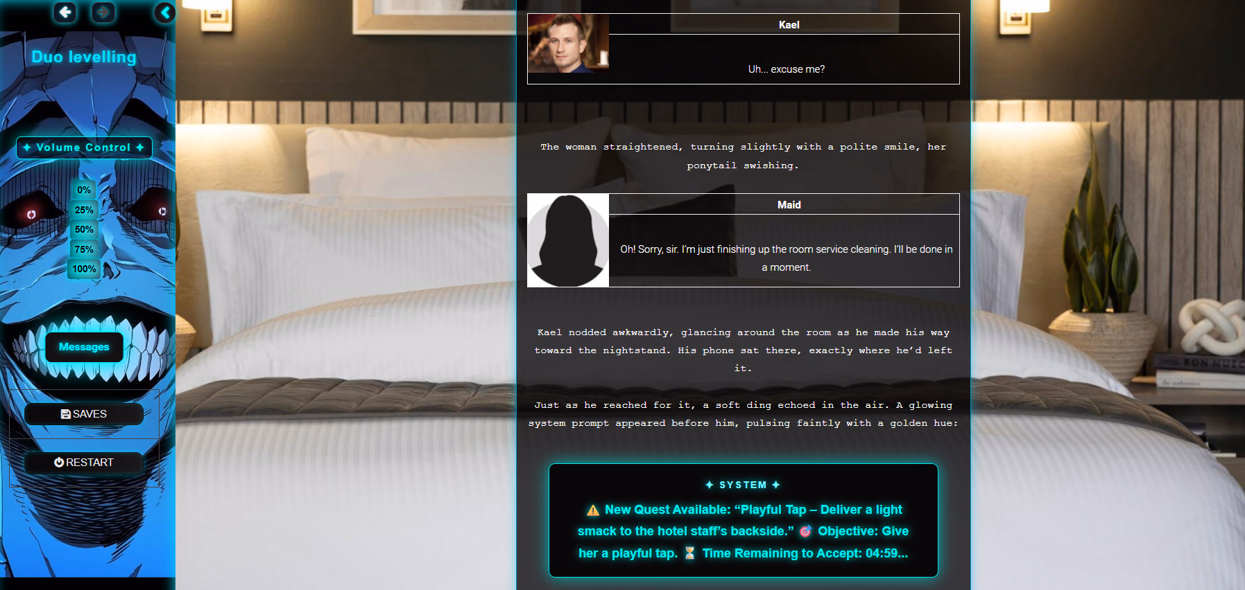 Let’s welcome our new game, Duo Leveling! In this game, we follow the journey of a married couple. For the start, we’ll keep the story linear, but as the story progresses, we’ll introduce branching paths and meaningful choices that shape the couple’s future.Inspired by the style of Solo Leveling, our couple will gain power and level up—but not by slaying monsters.