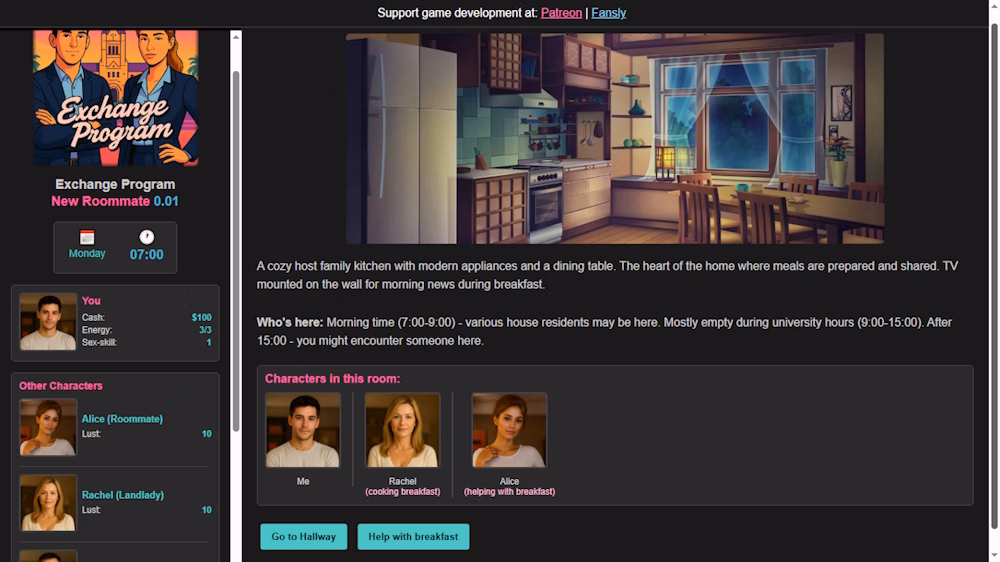 Sandbox NSFW RPG included real dev’s own content scenesYou are a young gifted guy from a poor family who recently won a student exchange program and came to a new country to study at a prestigious foreign high school. According to the rules of the exchange program, you were taken in by a family of lonely volunteers and given a small room to live in, you don’t have much money, so you got an extra job for now. A few days later, the volunteers put another bed in your room: as it turned out, another student won in the same program and – by the will of fate – she was assigned to the same high school, but there were no free living places for her, and to your great surprise – your host family agreed to accept an additional student to live in for the duration of the exchange​