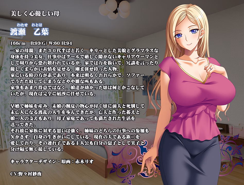 The older sister: Nagisa. The younger sister: Fuuka. Mother: Otoha.The main character’s father’s remarriage creates a family of three people who are not related by blood.Although the relationship is amiable, the new family members are beautiful women, and the protagonist is troubled by the closeness of his family. He sees his new relatives as women, and his lust grows everyday. Spoiler One day, he caught his father cheating on his step-mother. This deeply enrages him.He’s constantly suppressing his desire, and his father was cheating!He felt like a fool for trying to stop his feelings. If his father was going to leave their family behind, then he vows to make his family his property.That night, he witnessed his mother dozing off, and decides to molest her, but while he was enjoying his mother’s seductive body, his sister witness the scene…