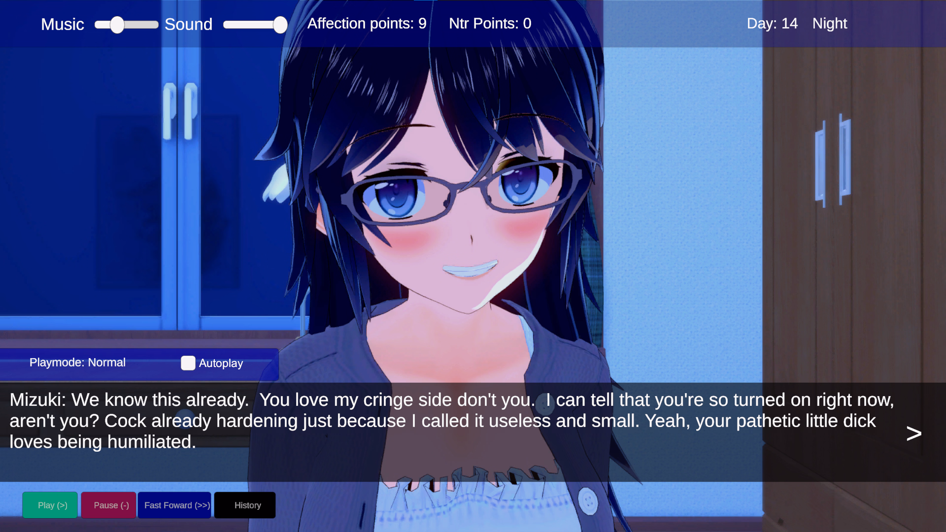 My Girlfriend Mizuki you take control of Hiro who is in love with his Girlfriend Mizuki. He has this crush since the third grade and he is constantly thinking about her. They currently go to the same university called hope university. He thinks about her so much that he is constantly jacking off or cumming in his sleep. He also developed a kink where he would randomly daydream other men hitting on her or fucking her. The game features a day system where you select what you want to do each part of the day. You may end the game whenever you want and whatever routes you completed will change the ending. With the special Red Rabbit route choices are insides the scenes with multiple endings instead of the general ending. There is currently six netorase routes, two netorare routes, an exhibition sex route, and a humiliation route. The more routes you complete the spicier the ending!