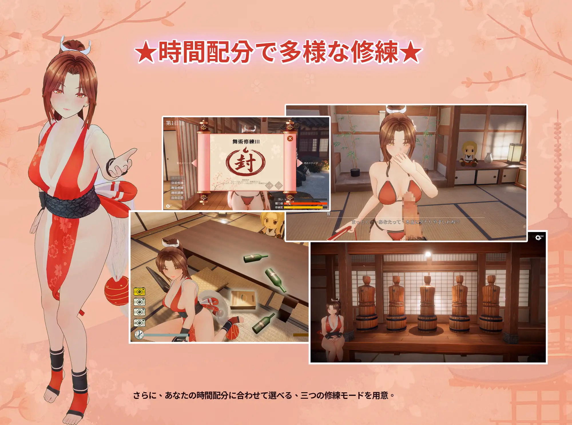 A young man applies to become an apprentice to a legendary female ninja master. But what awaited him was not only rigorous training ―― ninpo training full of temptation and lewdness….! Training that progresses according to the rhythm, H events that suddenly occur under certain conditions, And by overcoming training, you will be freed up in a variety of positions and costumes. Will he be able to become a true disciple, or will he be squeezed out by his master first――. An immersive 3D training simulation game is here! Spoiler