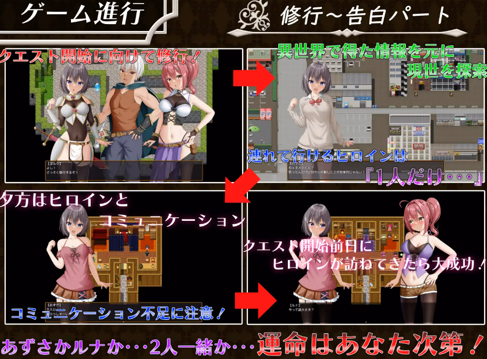 The Demon Lord’s army, empowered by absorbing various things and knowledge from our world, has grown stronger. Spoiler Thinking, “When it comes to another world, it’s fastest to ask the people who live there!”, Luna Blythe succeeds in summoning the protagonist and his classmate Azusa Kotonose.Though the situation makes no sense, Luna asks for their help in defeating the Demon Lord. Seeing Azusa’s serious gaze, driven by her concern for their own world’s future, the protagonist can’t bring himself to refuse—and decides to join them.Encounters, confessions, pure love, harems, violation, NTR…Depending on the player, the future changes in this Modern Fantasy RPG!
