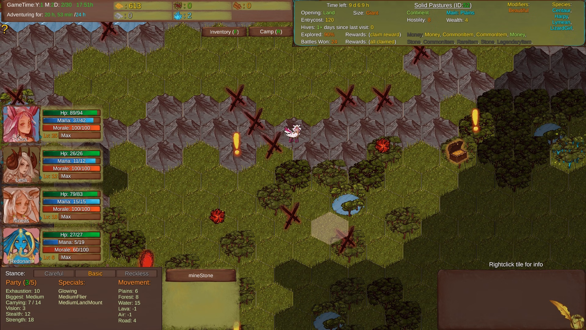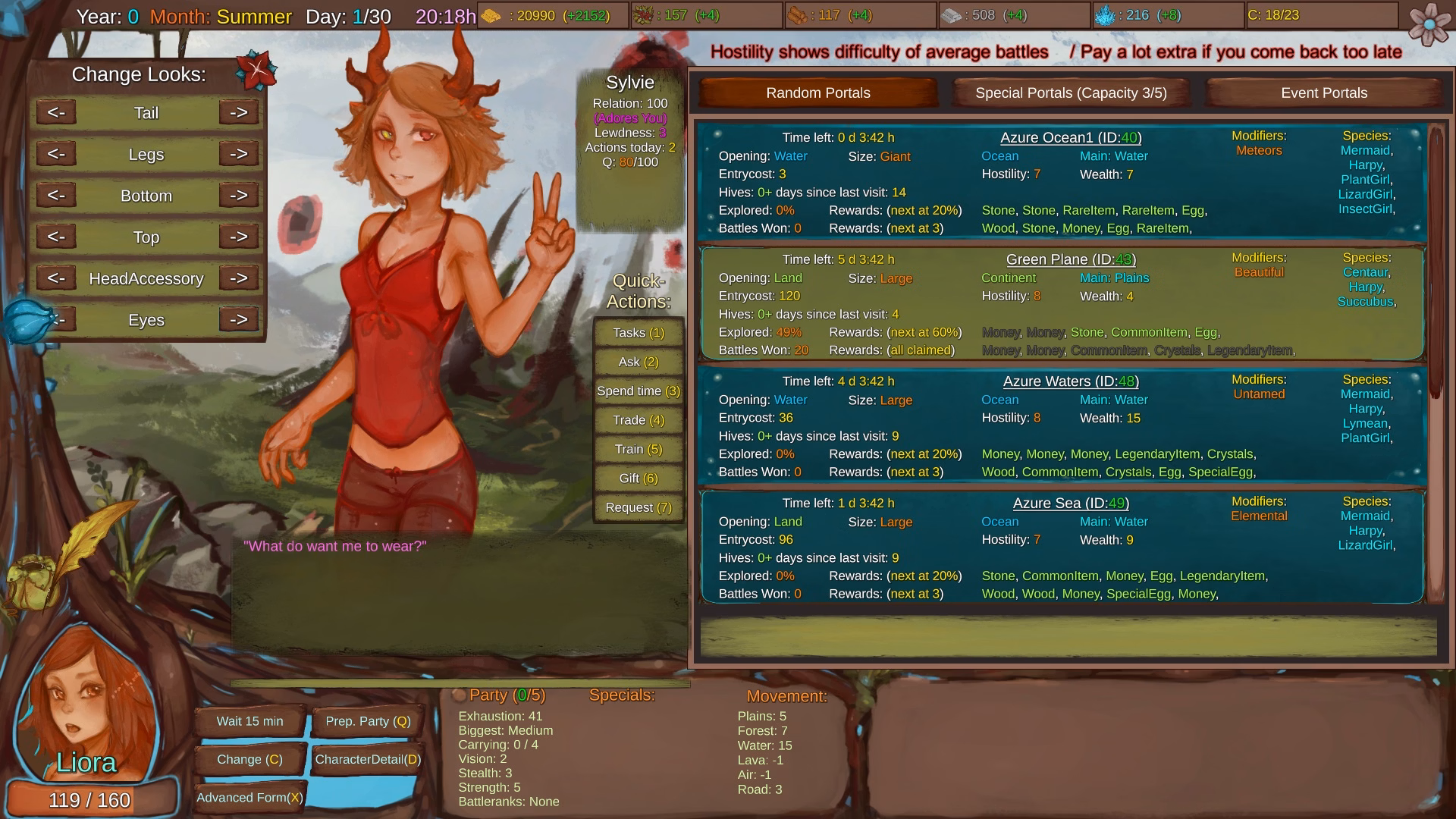 Portals of Phereon is an exploration/ management/ breeding / turnbased (on tilemaps) strategy game with Monstergirls. Spoiler: More Info Characters:There are 3 different maincharacters (female, male, futa) with a different set of abilities/ goals etc.There will be a lot of base species(currently 10 (Beast, Centaur, Harpy, Succubus, Mermaid, Plant,Insect, Lavagirl,Lizard and a Light Creature))and ALL possible combinations as hybrids as your characterpool to recruit from/ breed.(+ some special hybrids with more than 2 bases)Npcs will mostly be variants of those species or completely unique ones.Exploration:Go through randomly generated Portals, discovering/ recruiting new Species, finding interesting items/ events etc. and bring your rewards back home.Some portals may need flying characters etc. to access.The overworld map is also tile based.Combat:Turn based on a tile map with permadeath. Characters have a lot of unique abilities, passives based on species. First all your characters act then all enemy characters. To make permadeath/injuries in this system not too frustrating, ranged abilities are very limited so enemies couldnt just focus all their attacks on one of your characters, instantly killing it. Instead characters are able to seduce others from far away, increasing their lust. While their lust is above 50% they get a lot worse (take double dmg, deal half etc.), so ranged characters still have a big influence on the game while not feeling too unfair. At 100% lust characters cant do anything except masturbate/fuck, effectively stunning them for a round.mana and hp never regen naturally and the gametime passes during combat, making every single battle important, forcing you to think about how you want to prioritize your ressources (hp, mana, time, characters, etc.). (I always hate completely meaningless filler battles in games).Breeding:Breed your characters’ traits/stats to create a team specially tailored to your playstyle and/or portal environments or to prepare for certain fights/fullfill requests etc.Town:fight in arenastrain your characters/your sexSkills and put them to use in the brothelbuild upgrades etc.do quests/ interact with npcsSexScenes:They will mostly be Image slideshows with descriptions etc. (maybe sometimes animated)There will be a lot of random events that occur based on your party/ biome/ rng etc.Npcs will have more complex scenes where you have a lot of choices.I try to have everything porn related to also have gameplay consequences, so seeing sexScenes etc. is not the reward in itself, otherwise it would feel weird to be punished for it gameplay-wise.