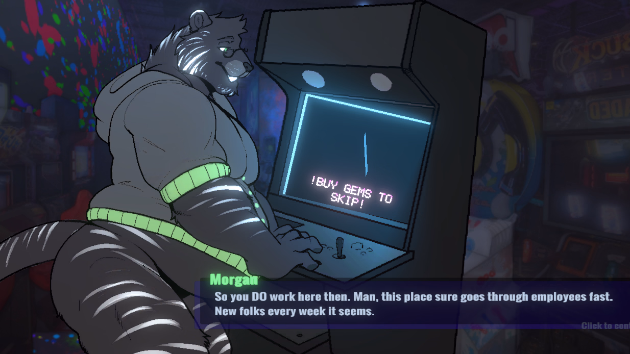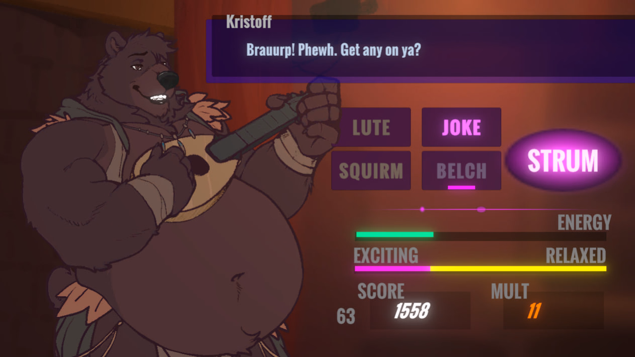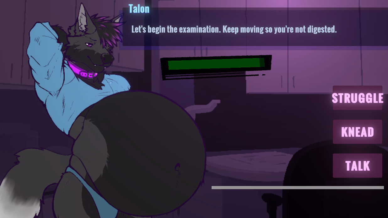 Press To Struggle (P2S) is a furry vore simulation. You’re making the best of a bad(?) situation. Your stamina bar drains when using most actions, when it runs out you are confronted with the ending scenario that you arguably deserve!