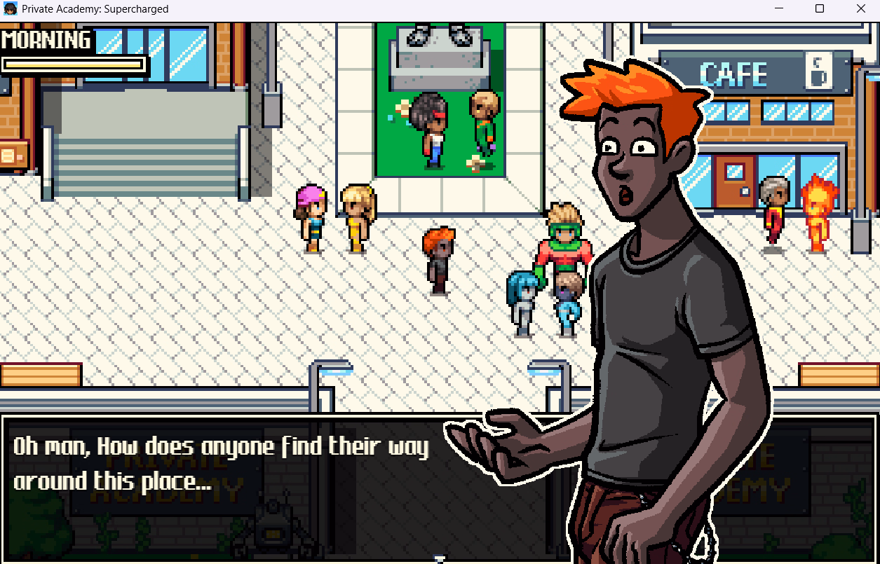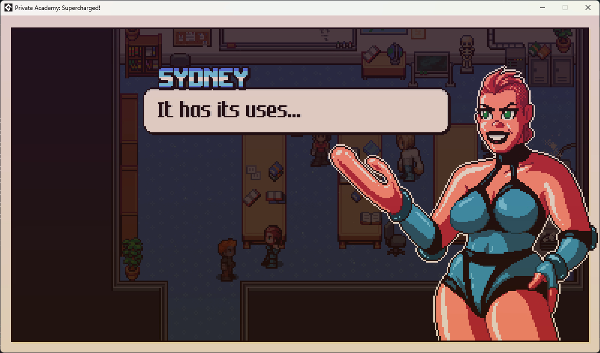 PA:S is an old-school ARPG in the traditional style. Expect chunky pixel art, bright colours, and more robots to punch than you could possibly hope for. It’s about a college for students with special, super abilities, and the adventures and hijinks they get up to. And, you know, there’ll be a whole bunch of good-natured sexy stuff, because that’s how I roll. You play as the latest recruit, trying to find your place in the student body and (something-something-dirty-pun-about-student-bodies). Make new friends, enemies and even lovers as you investigate the mysteries of the college and try to keep your city safe from superhuman threats. If this all sounds familiar, well, it’s supposed to. The storylines and character designs are an intentional nod to certain mutant-based comics from the early- to mid-nineties – objectively the most fun and downright horniest period of superhero comics. Spoiler: 2025 Trailer More Videos in Developer Notes!