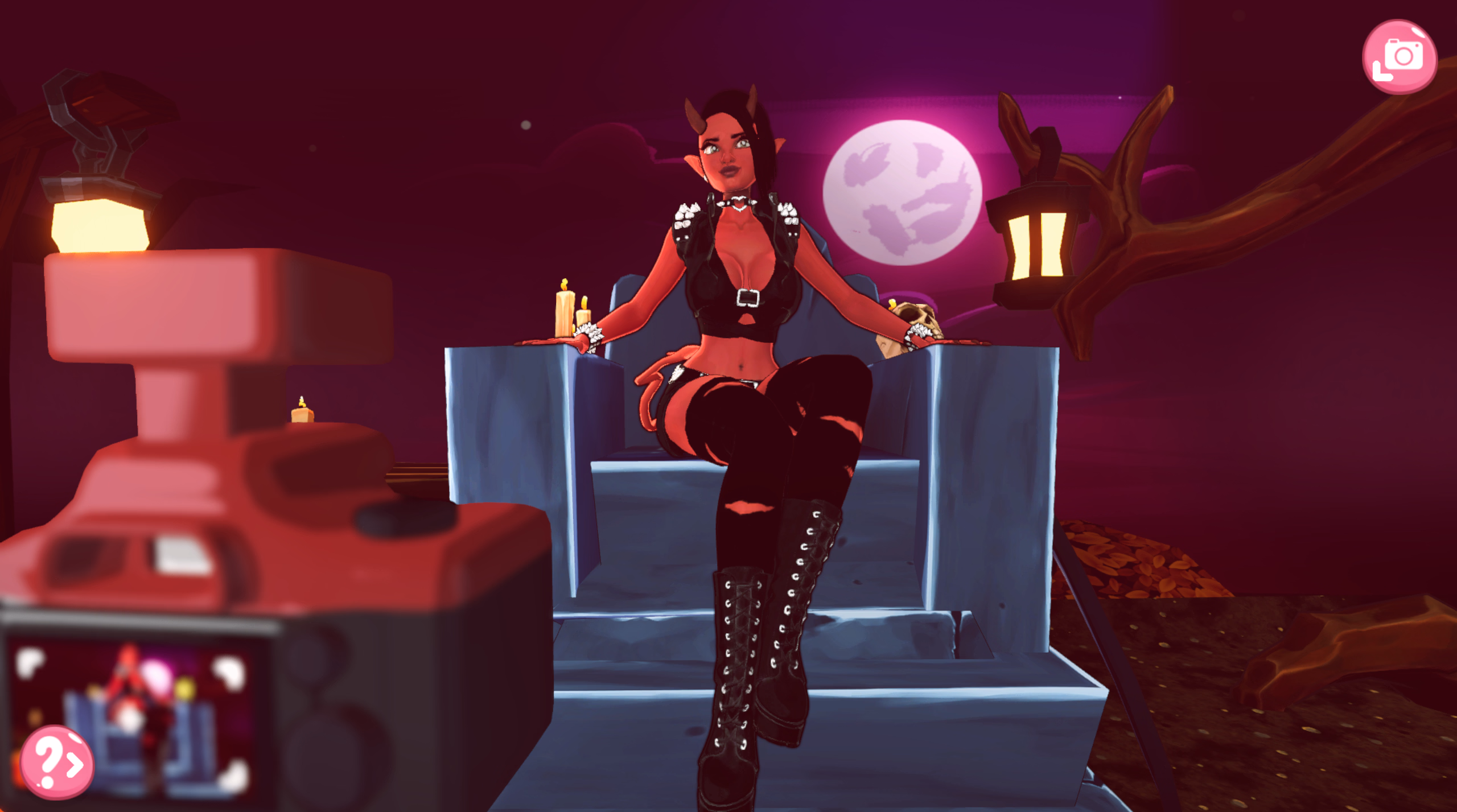 You are a photographer hired for a Halloween-themed photo shoot with model Tiffany Starlet, who shows up at your studio wearing a hellish costume.During the shoot, you’ll have a hot conversation with the girl, and if you give the right answers, you may end up with a happy Halloween ending.