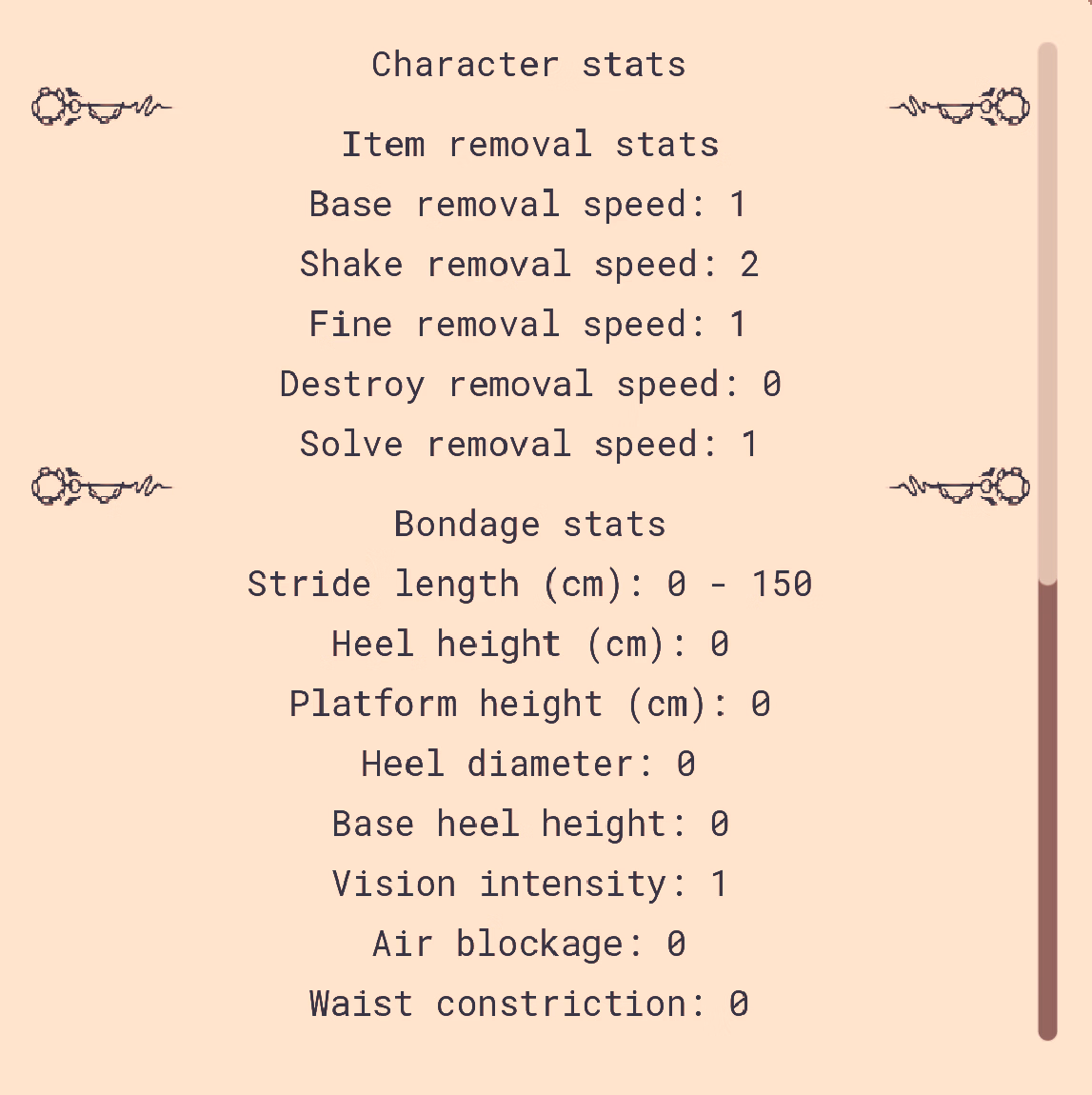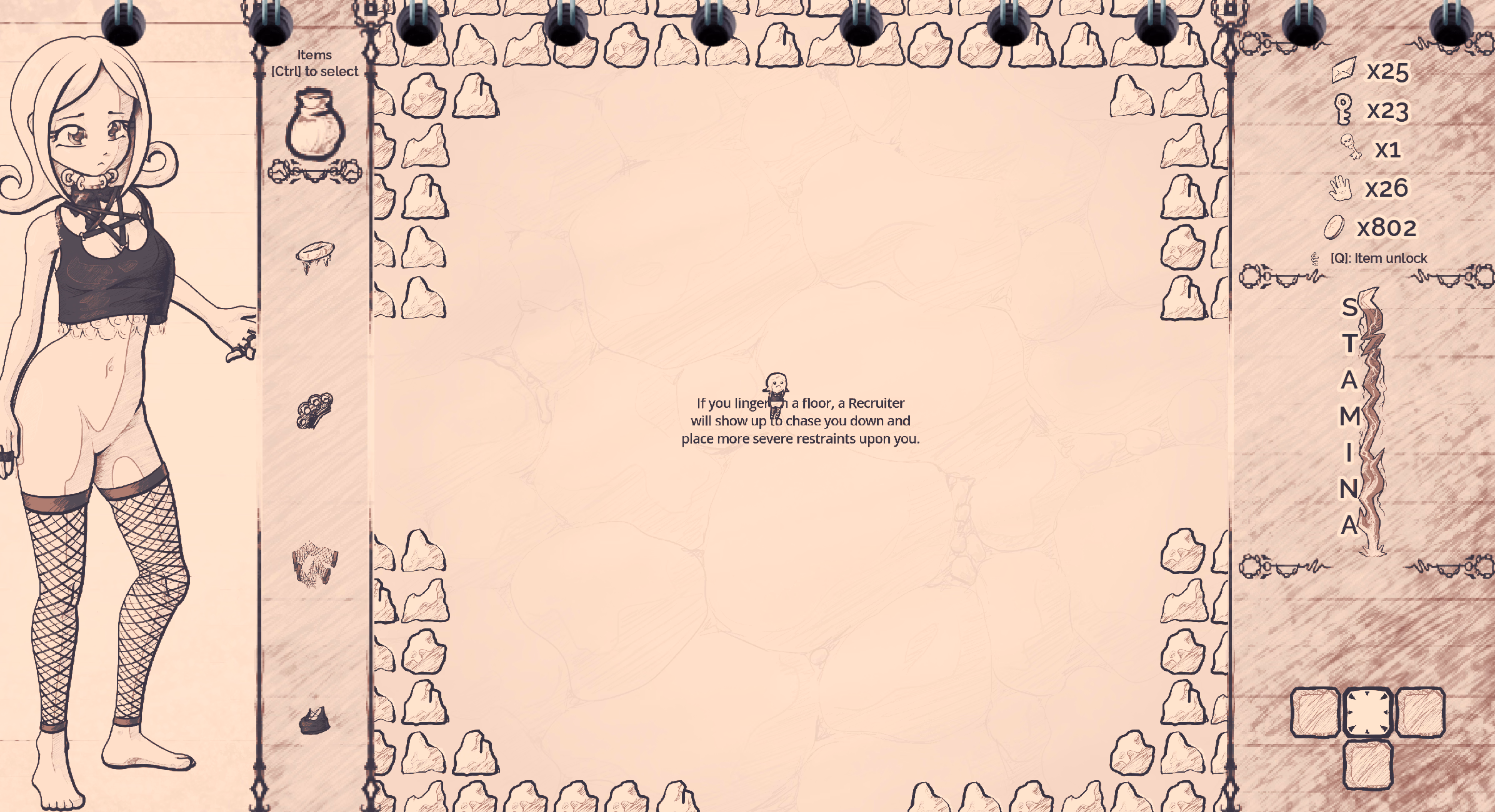 Players assume the role of Eliza, who finds herself trapped in a Control Suit and must traverse six perilous floors of a dungeon controlled by a slave cult to secure her freedom. Each floor is riddled with dangerous enemies and devious traps designed to restrain her using devices like armbinders, ropes, shock collars, and ballet boots.