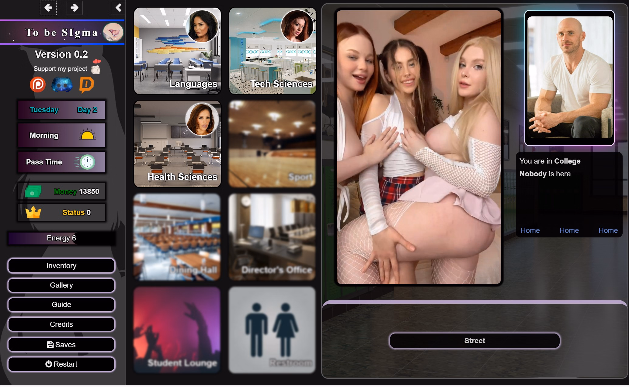 TobeSIgma is embarking on its journey as a promising game with a vast world and variability.The game follows a specific storyline: you play as the protagonist, an unremarkable young man whose stepfather recently passed away, leaving you with two sisters and a mother. Life challenges you to become independent and explore this world. While you are still at the initial stage of the game and haven’t seen the larger world yet, you are already on the path to becoming a Sigma, learning to seduce and utilize female sexuality for your goals. In the near future, you will undoubtedly become the owner of large companies and create subordinates to your liking. Spoiler The game is in its early stages, and many characters are still awaiting their debut. Some characters in the game deserve their path as envisioned by the author, while others will be determined by voting, as a form of free creativity, for those interested in participating.Another goal of the game is to compile a significant amount of content featuring enticing ladies whose sexuality captivates us all. In any case, it’s a fun endeavor, and I’m grateful to everyone who joins, supports, and collaborates in creating this game.SIgma to everyone!