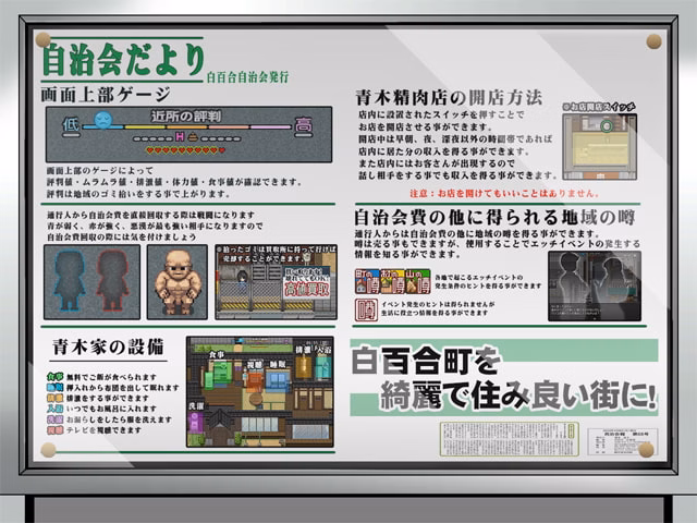 Umeko Aoki had been living a happy married life,but lost her husband in a sudden accident, and hit rock-bottom.A few months later…Though filled with sadness, she gradually got used to living alone,and began to feel hopeful for the future… Spoiler: More Her late husband’s sister Yuka dropped by.She saw the sadness and loneliness in Umeko,and to help accompany her in this time of need,suggested that she move closer to the step-family.Umeko hated to be a burden upon people,but couldn’t say no to the invitation…More than anything, to fill the empty hole in her heart,she agreed to move in to her step-parent’s house.Her step-parents were out on vacation, while Umeko house-sat.Thus began some time alone in Shirayuri town…She took this time to reflect on her life,come to terms with her husband’s death,and start life anew…Live life while interacting with the people of Shirayuri town, Kuroyuri village, and Pikone mountain!Regional development using her mind and body begins!Regional Development Survival RPG! Warning! The game has a lot of scat.
